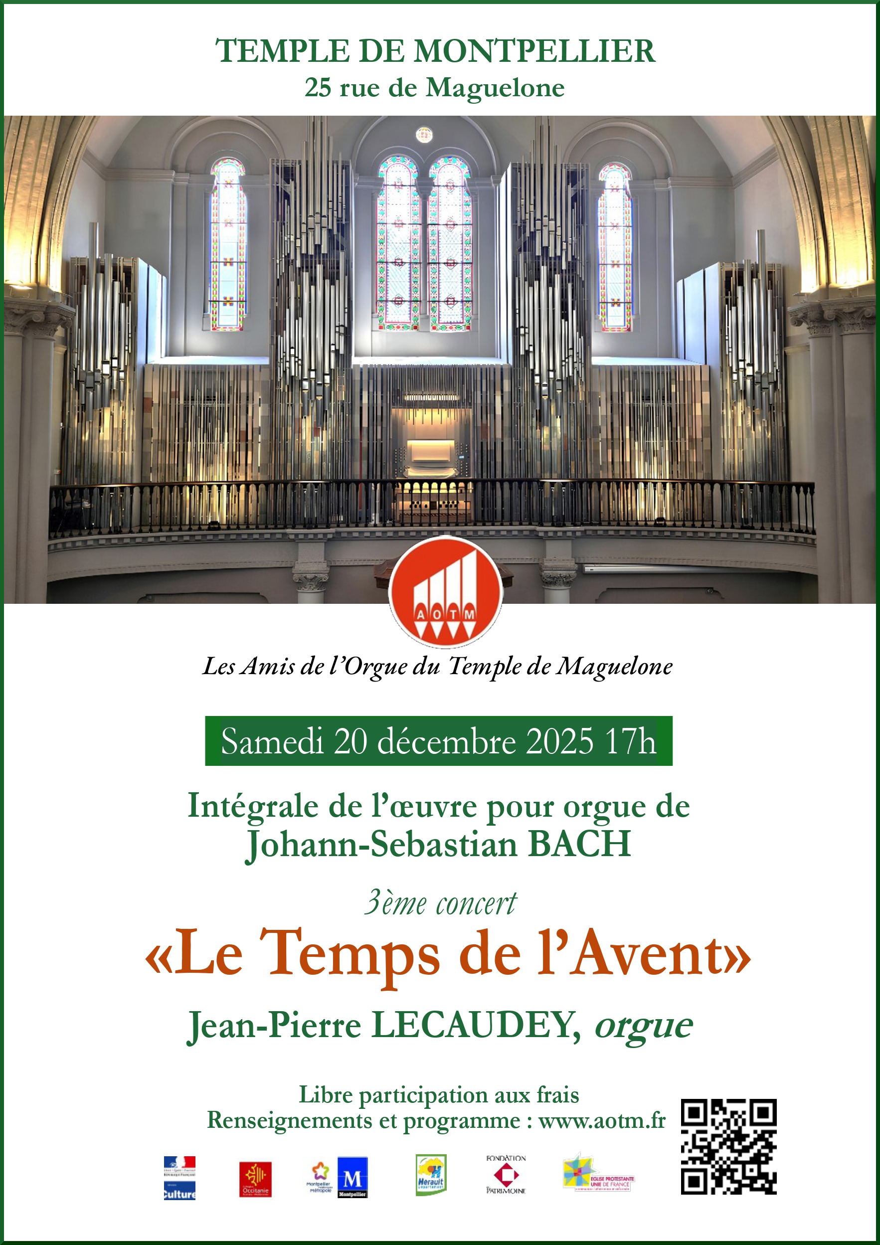 L’intégrale de l’œuvre de Bach pour orgue se poursuit. Nos amis organistes Jean-Pierre Lecaudey et Luc Antonini ont bâti un programme suivant l’année liturgique ; après « Le Temps de l’Avent » du mois de décembre, voici la suite : « Le Temps de Noël I » le 3 janvier 2026 à 17h avec Jean-Pierre Lecaudey « Le Temps de Noël II » le 24 janvier, à 17h avec Luc Antonini « Le Carême » le 14 février, à 17h avec Luc Antonini. « La Passion » le 28 mars, à 17h avec Luc Antonini.